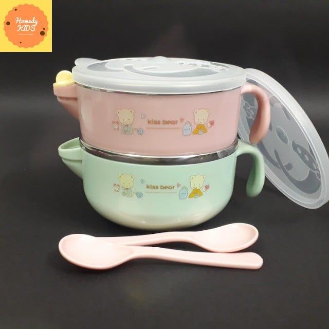 Chén Ăn Dặm Inox Cách Nhiệt Cho Bé Có Tay Cầm Nắp Đậy Kèm Thìa Muỗng