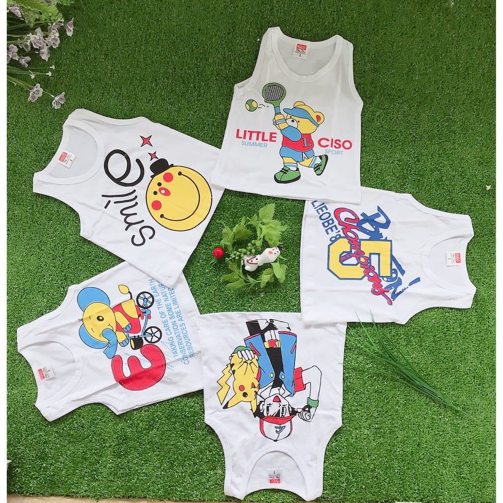 Sản phẩm mang đến sự thoải mái nhất với kiểu cổ tròn, tay cộc, bé sẽ không cảm thấy bị nóng hay khó chịu khi vận động nhiều. Bên cạnh đó, mỗi áo in mỗi hình động vật khác như hình gấu, thỏ, chuột,... chắc chắn sẽ khiến bé cảm thấy thích thú khi mặc.
